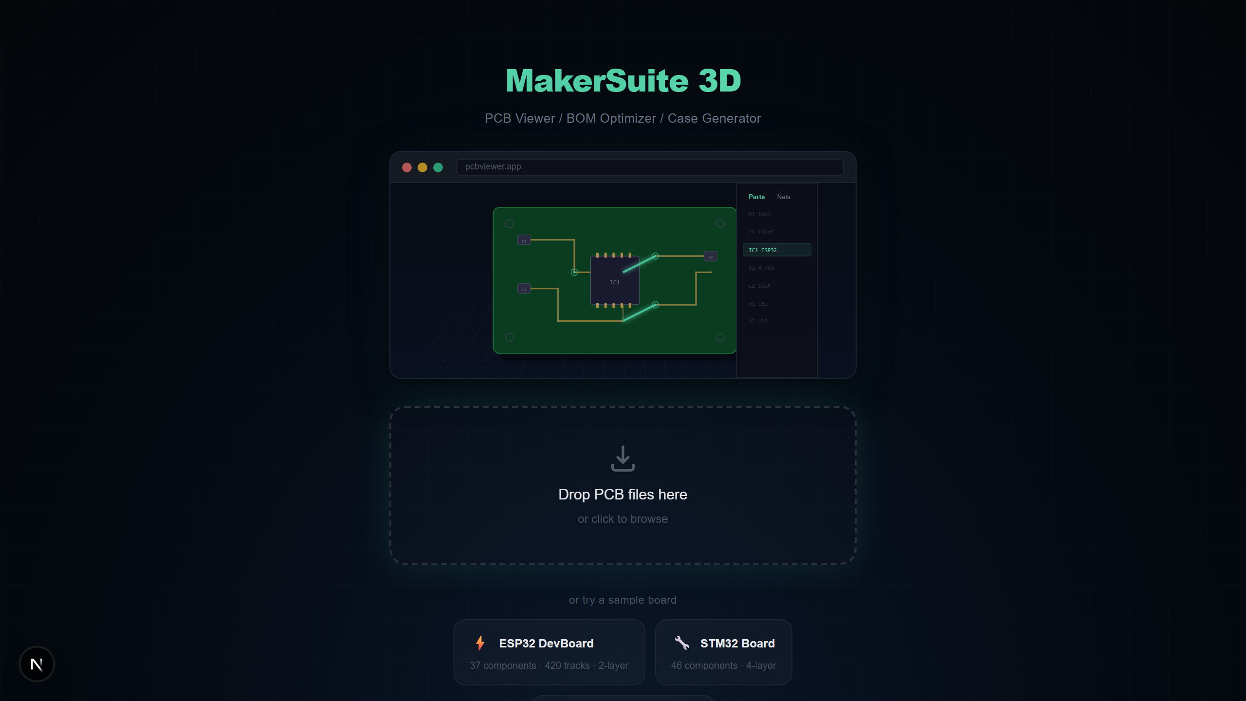Traditional PCB viewers like KiCad, Altium Designer, and Eagle require large desktop installations. MakerSuite 3D runs entirely in your browser — drag, drop, done.